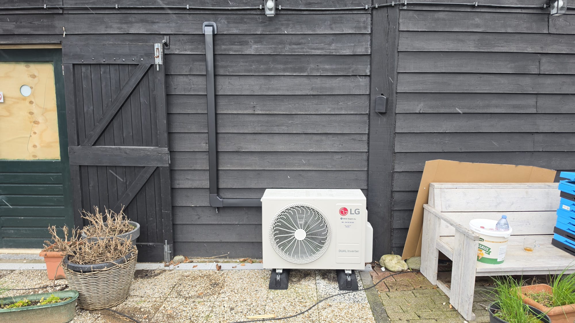 Op de foto’s is goed te zien dat de installatie netjes is uitgevoerd. Binnen is de LG binnenunit strak geplaatst op een logische plek in de winkel. Buiten is de buitenunit verzorgd opgesteld en is het leidingwerk netjes weggewerkt, passend bij de donkere gevel.